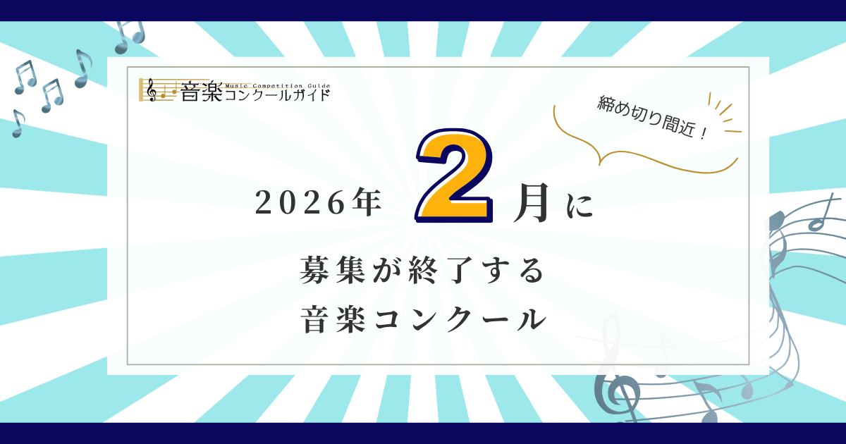 2026年2月に応募締切を迎える主要音楽コンクールを網羅!かながわ音楽コンクールや飯塚新人音楽コンクール、びわ湖国際フルートなど、2026年度の活動を左右する重要な募集情報をまとめました。必着期限や音源提出など、チャンスを逃さないよう今すぐチェック!